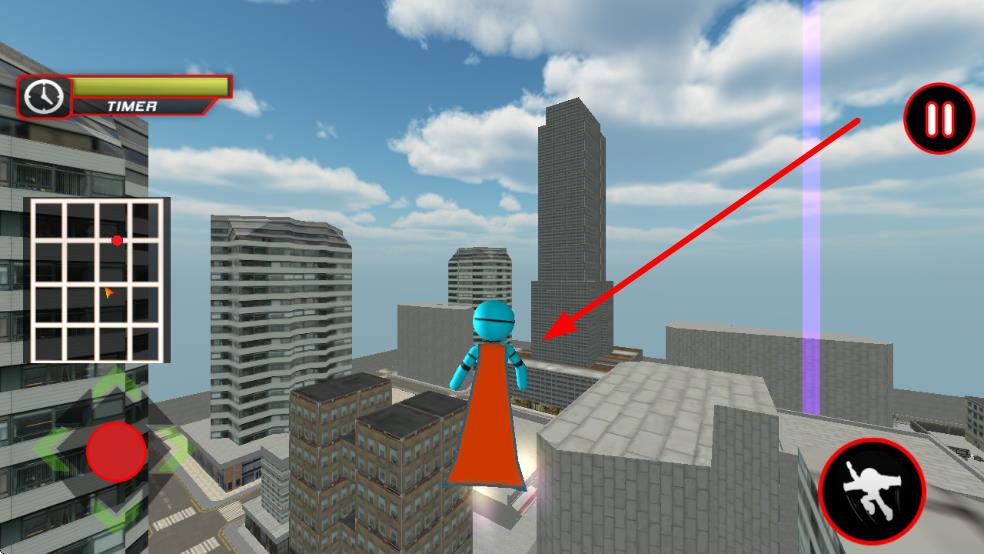 3、操控火柴人英雄飞向目标建筑,可利用屏幕左侧虚拟摇杆调整移动方向,右侧按钮控制飞行、特技等动作,在规定时间内抵达目标点推进关卡。