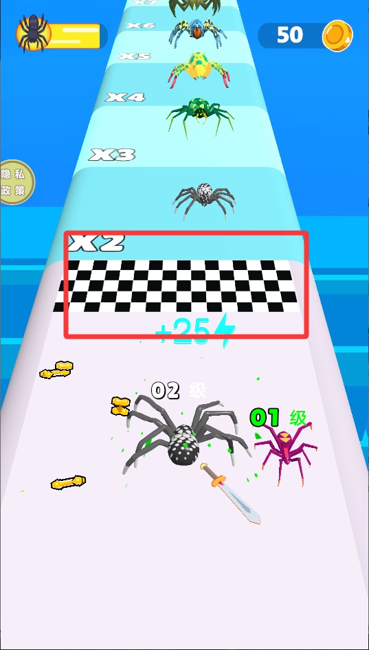 1、控制蜘蛛左右移动躲避障碍,通过抓住时机攻击沿途昆虫敌人。连击次数越多获得分数加成越高。