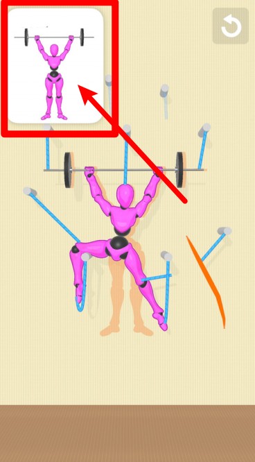 2.举重动作:参考左上角的目标动作图,调整玩偶手臂与身体的位置,通过精准剪切让角色还原举重的标准姿势。
