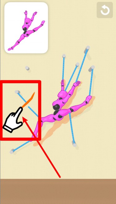 3.剪绳操作:用手指滑动剪掉绳索,控制玩偶的肢体移动,成功让角色摆出正确姿态完成关卡任务。