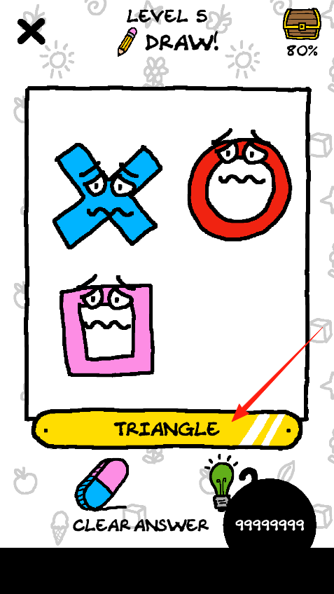 2、到第5关,看到三个带表情的图形,下方提示TRIANGLE,用画笔在画板上画三角形,画对了就能让图形开心,通过这一关,继续挑战下一个绘画任务。