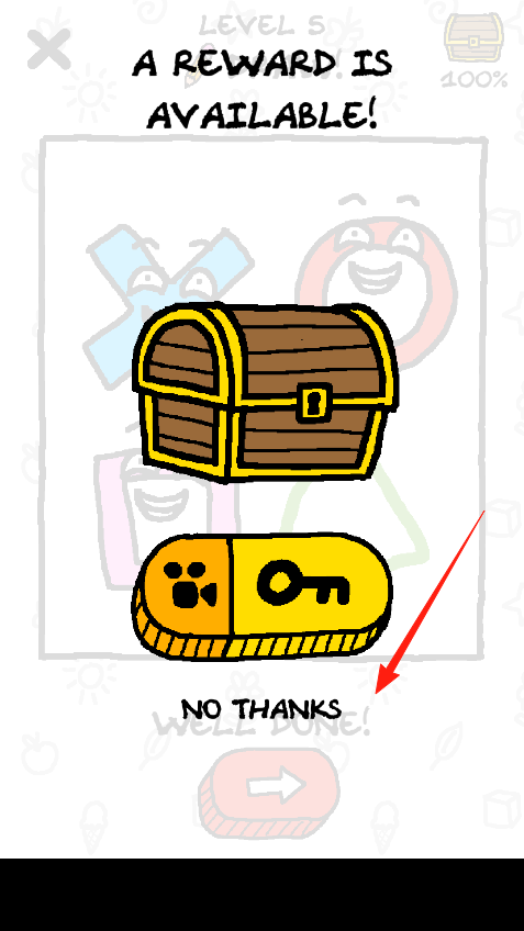 3、通关后出现奖励界面,有宝箱和道具,要是不想拿奖励,点NO THANKS直接进入下一关,想拿就点宝箱,不过选NO THANKS能快速继续画画冒险,看自己咋选。