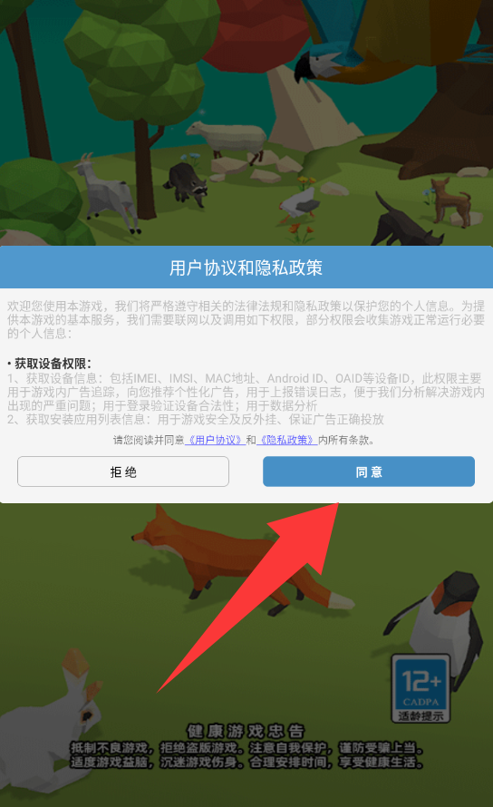 1、点击用户协议和隐私政策里的同意并继续。