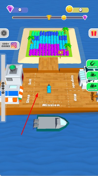 3、装满矿石后,驾驶采石车返回船上Sell区域,售卖矿石获取金币,用金币改装车辆。