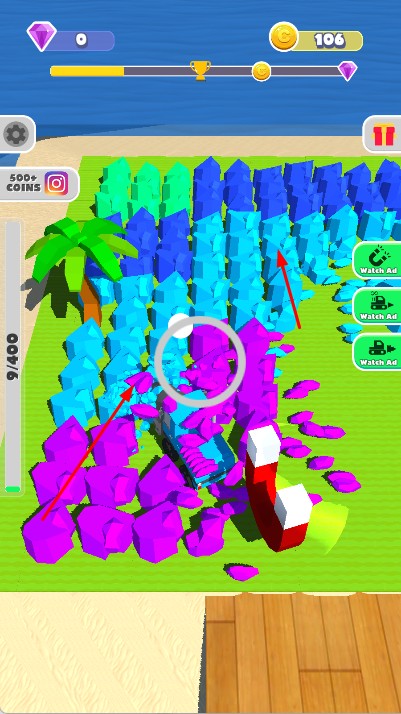 2、驾驶采石车驶入岛屿,利用车上磁铁等工具,吸附紫色、蓝色等矿石,收集资源。