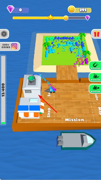 1、进入游戏,操控蓝色采石车在船上Mission区域准备,点击出发前往岛屿矿石区。