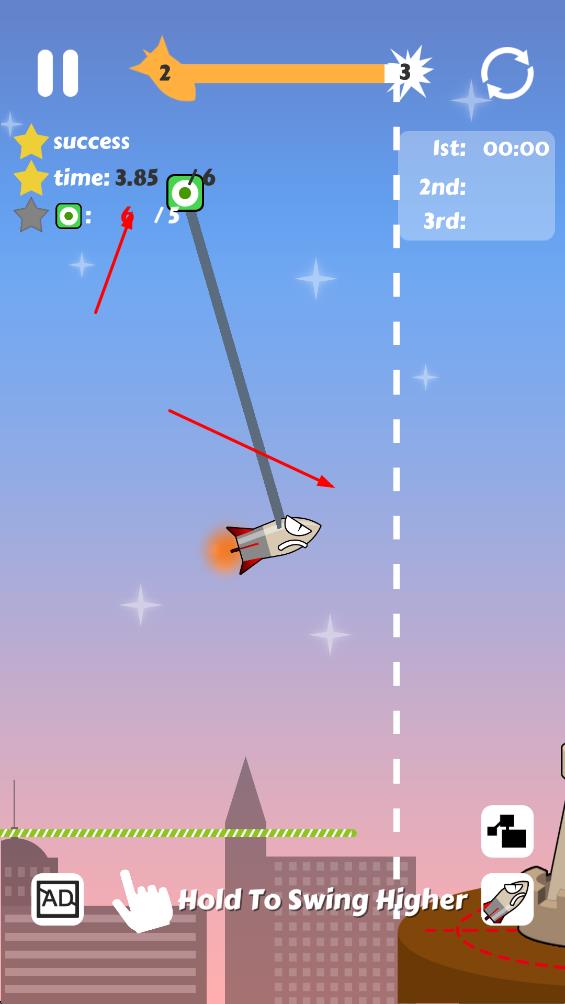 3、调整摆动轨迹,让火箭飞向终点建筑,完成关卡挑战。