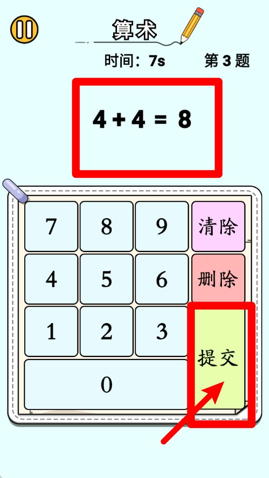 2.根据屏幕中央显示的题目输入正确答案,然后点击“提交”按钮确认答案,以便进入下一道题目。