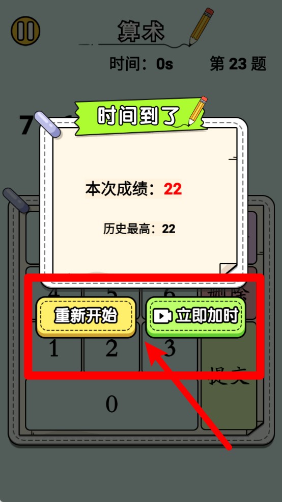 3.当时间耗尽时,会显示本次成绩与历史最高分,可选择“重新开始”继续挑战,或观看视频加时延长游戏时间。
