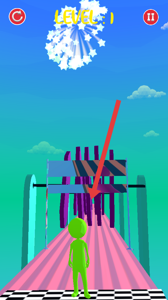 3、到终点触发烟花,若失败点左上角重玩,熟悉障碍的规律后,速通Level1,为后续的关卡练手。