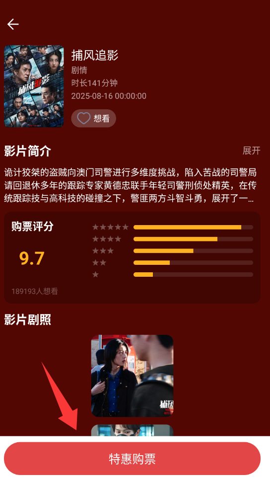 3、哗,这个购票评分9.7分好高啊,点击红色箭头里的特惠购票。