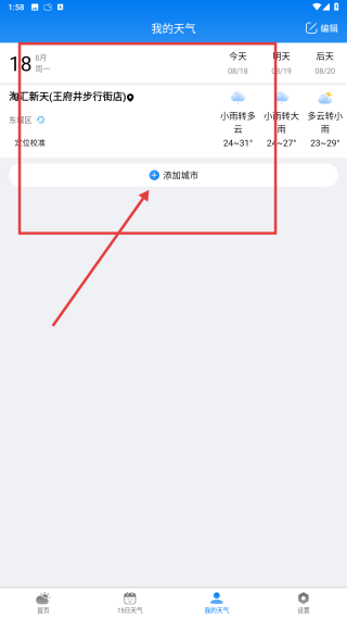 3、在我的天气界面,点击添加城市按钮,输入新地点,可添加其他城市天气,方便跨城市出行查看。