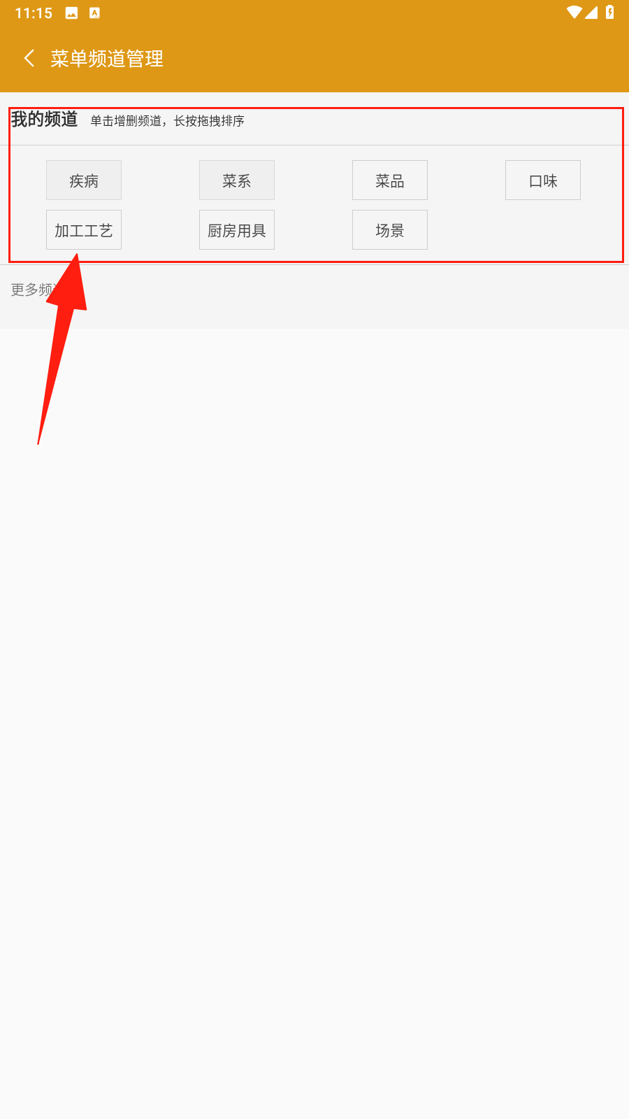 3、进入菜单频道管理,增删疾病、加工工艺等频道,长按拖拽排序,自定义显示分类。