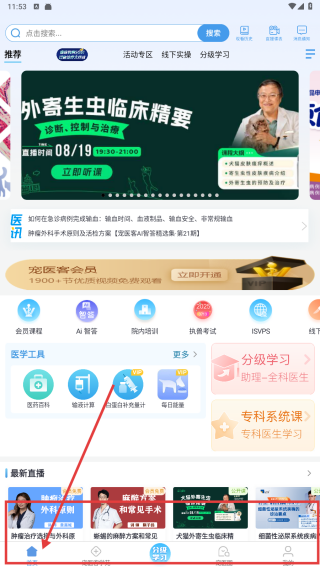 1、进入APP首页,点击底部医”栏,浏览最新直播等内容,找到感兴趣的医学直播课程,获取临床知识句号。