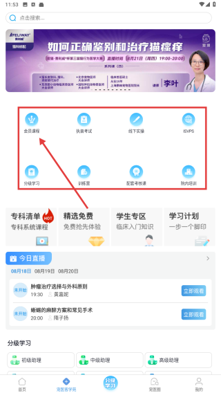 2、在医学页面,利用会员课程等功能入口,进入课程界面,通过会员课程等按钮,开启系统医学学习句号。