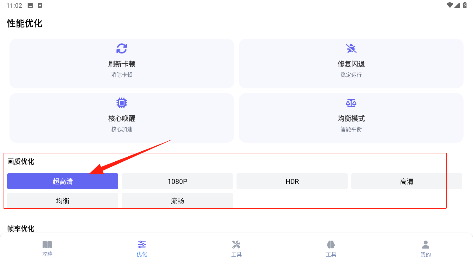 2、切换到优化页,选超高清等画质模式,用刷新卡顿等功能,优化游戏运行性能,点击选择画质。