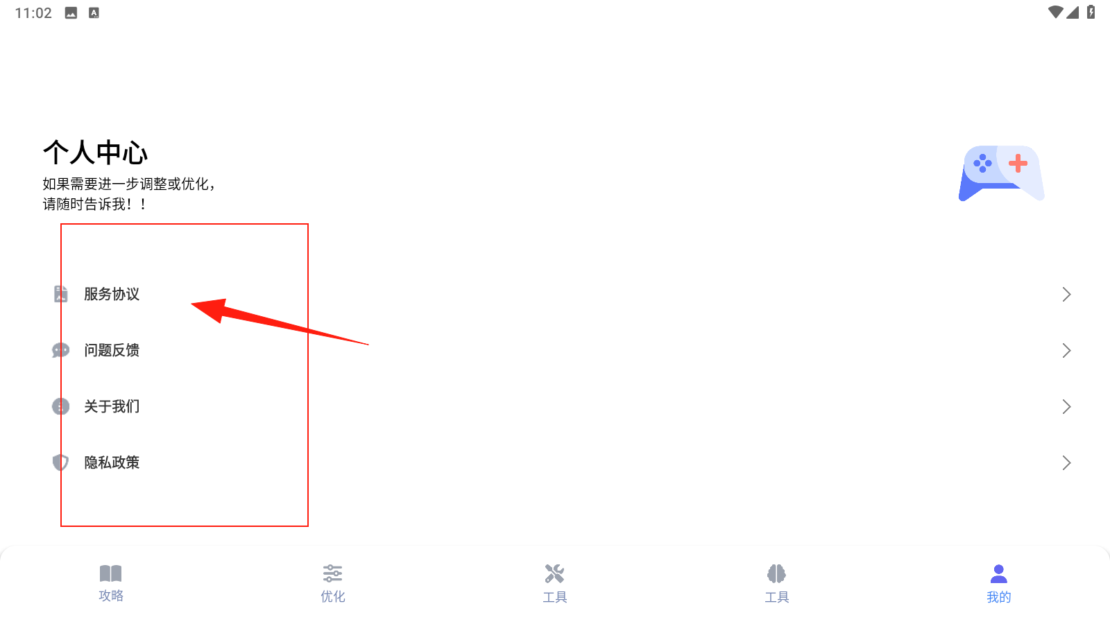 3、进入我的页面,查看服务协议、隐私政策,反馈问题,了解工具相关服务与规则,点击查看。