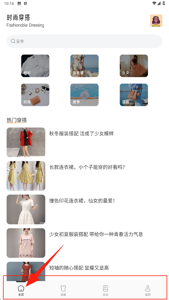 1、在时尚穿搭首页,浏览分类衬衫、连衣裙等和热门穿搭文章,点击查看详情。