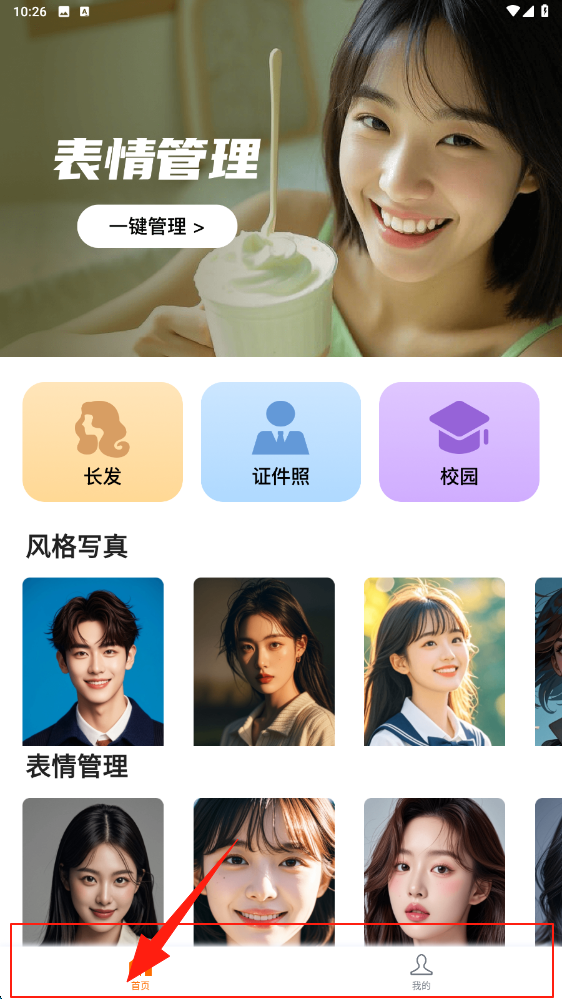 2、切换到表情管理首页,选择长发、证件照等风格,查看风格写真、管理表情素材。