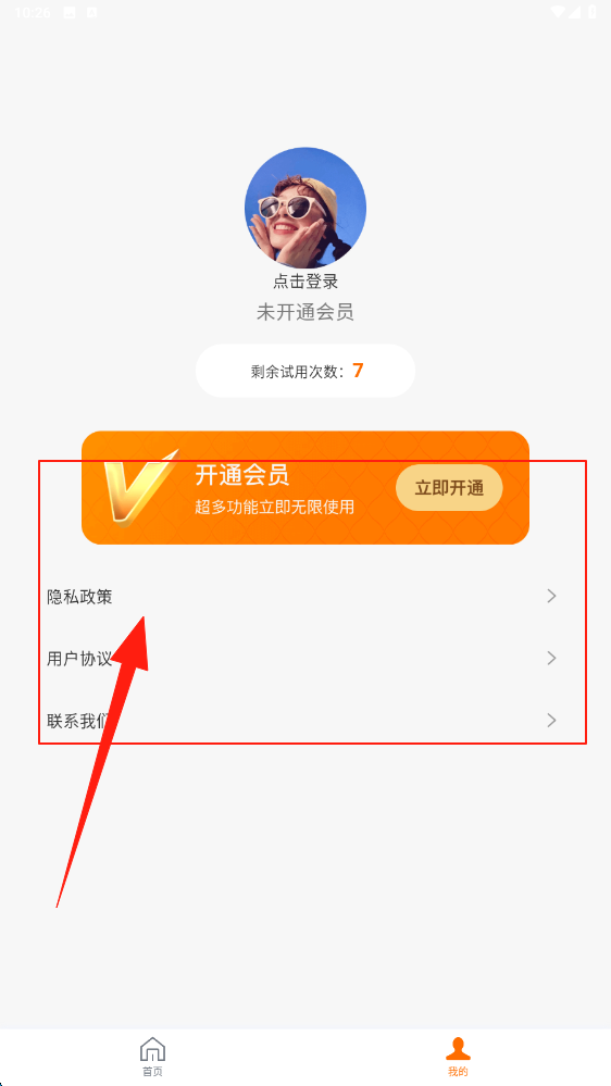 3、进入表情管理“我的”页面,登录账号,查看剩余试用次数,管理隐私政策、用户协议。