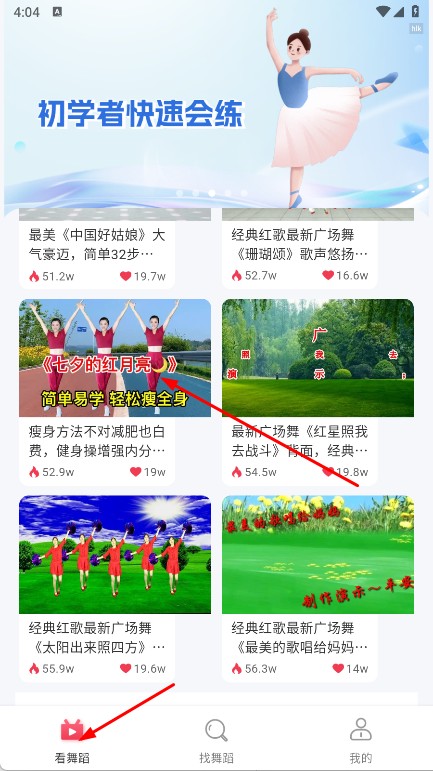 1、打开活力广场舞大全,在看舞”页,浏览初学者快速会练推荐,点击视频即可观看学习。