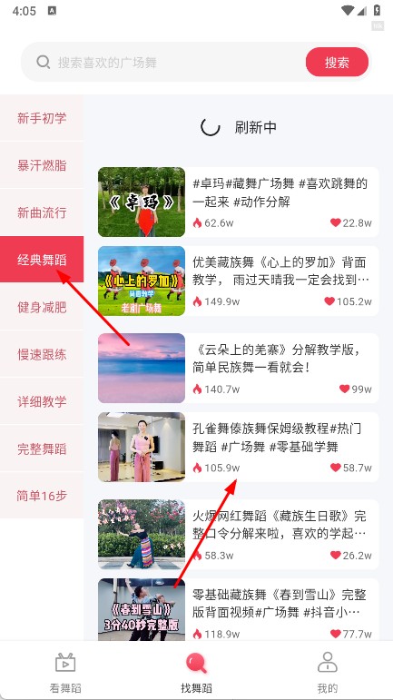 2、切换到找舞蹈页,按分类筛选,如选择经典舞蹈,找喜欢的广场舞,查看详细分解教学。