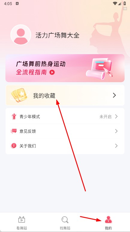 3、进入我的页,点击我的收藏查看收藏的舞蹈,遇到想学习的舞蹈,收藏后离线下载,掌握广场舞舞步。