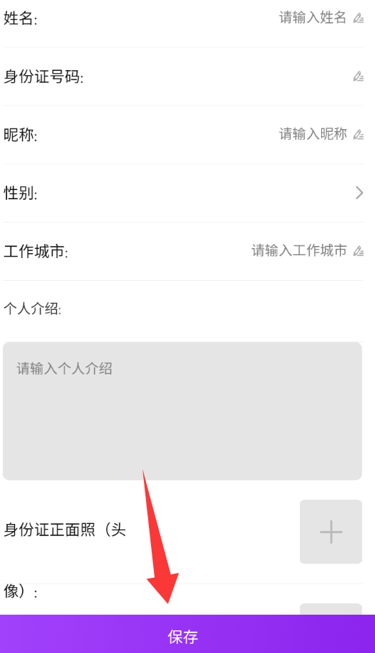4、填写姓名身份证号码和性别上传头像点击保存。