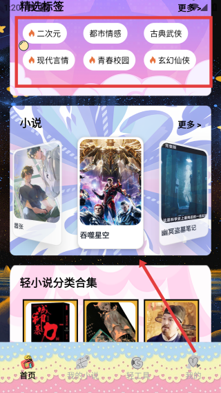 1、有二次元,都市情感等精选标签,你可以点击喜欢的标签,找到对应类型的小说,下面还有推荐的小说像吞噬星空,要是想看更多小说,就点更多。