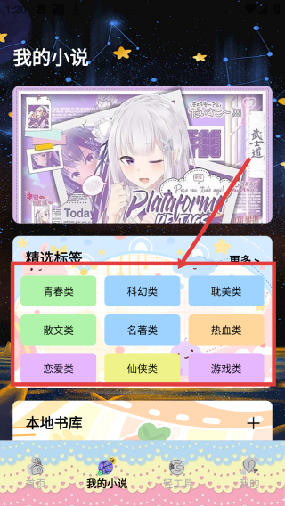 2、在我的小说页面,有青春类科幻类等精选标签,方便你筛选自己感兴趣的小说类型,你还能查看本地书库,管理自己下载的小说,让阅读更有条理。