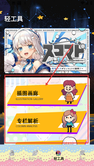 3、轻工具页面里有插图画廊和专栏解析功能,你可以进入插图画廊,欣赏各种小说相关的插画,也能看看专栏解析,深入了解小说的创作等内容,丰富阅读体验。
