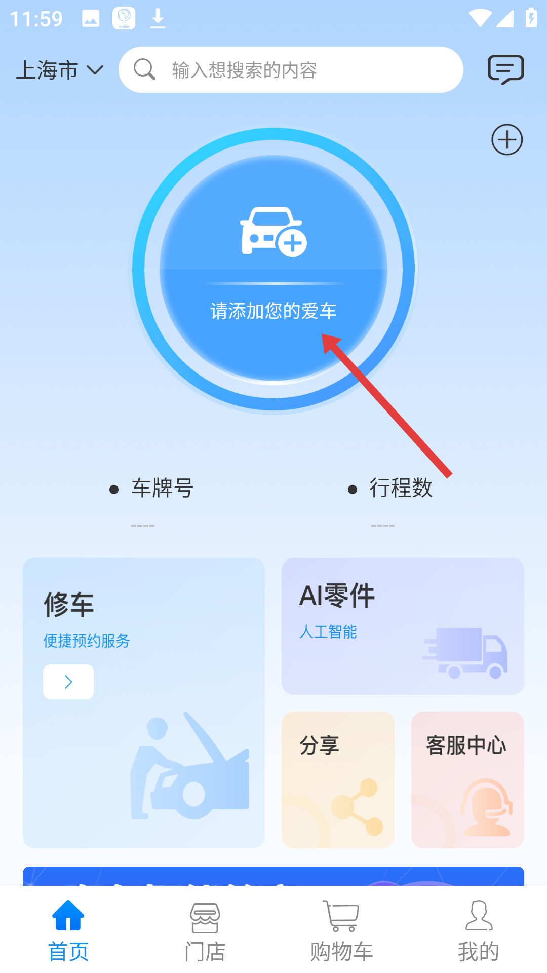 1、这个页面是汽车服务类软件的首页,你可以先添加自己的爱车信息,添加好后,就能使用修车的便捷预约服务,也能分享软件或者联系客服中心。