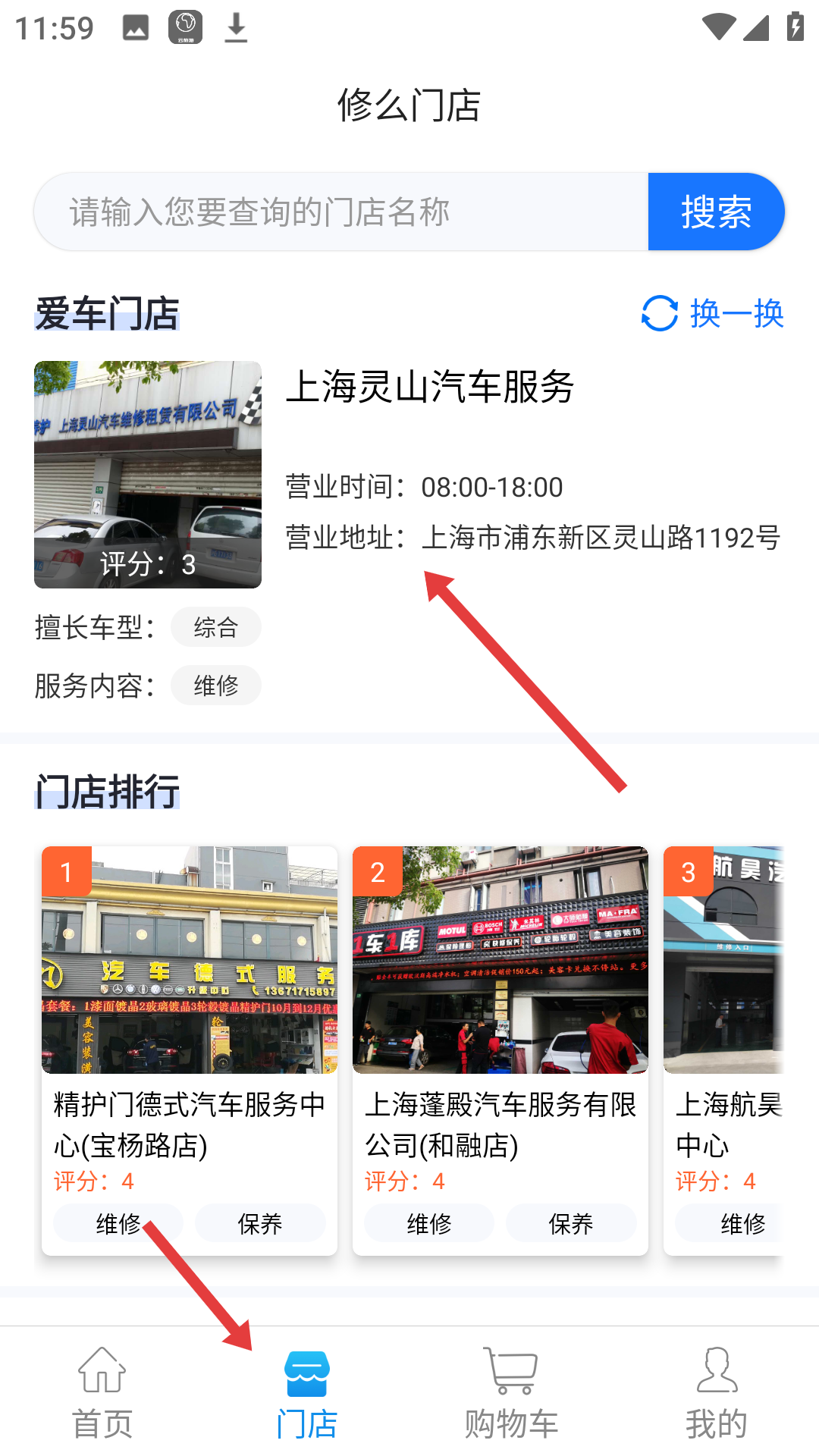 2、在门店页面,你可以搜索想要查询的门店名称也能看看爱车门店里推荐的店铺,像上海灵山汽车服务,能了解它的营业时间地址等,还能查看门店排行。