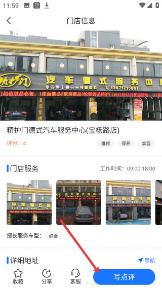 3、进入门店信息页面后,能看到门店的服务项目,比如维修保养美容等,还有工作时间和擅长服务的车型,你可以收藏这个门店,方便以后找到,也能分享给朋友。