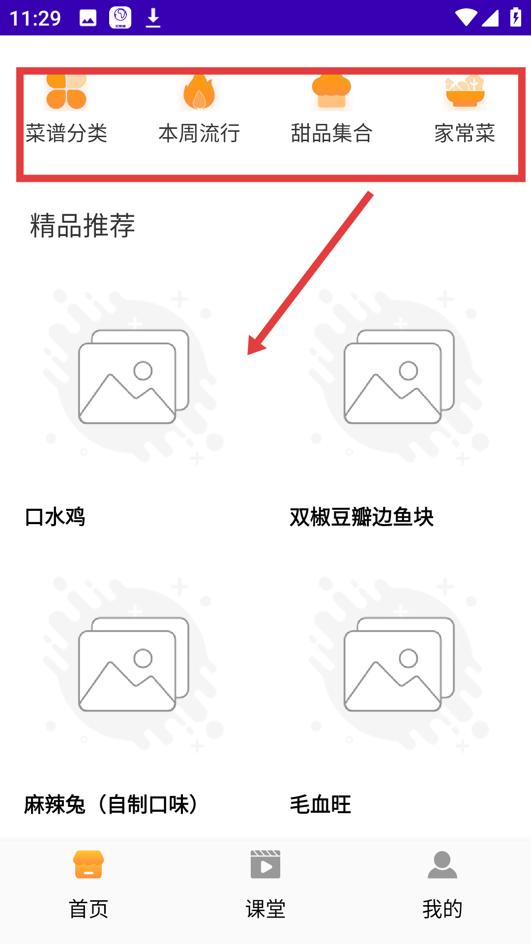 2、在首页里,有菜谱分类,本周流行这些分类标签,你点击不同的标签,就能看到对应类别的精品推荐菜谱,像口水鸡,双椒豆瓣边鱼块这些,方便你根据分类找到感兴趣的菜谱。