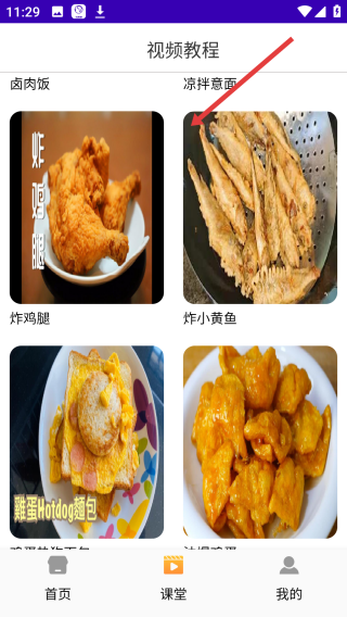 3、这是课堂页面,展示了各种美食的视频教程,像炸鸡腿,炸小黄鱼等,你可以点击喜欢的美食视频,跟着视频里的步骤学习制作美食,轻松掌握烹饪技巧。