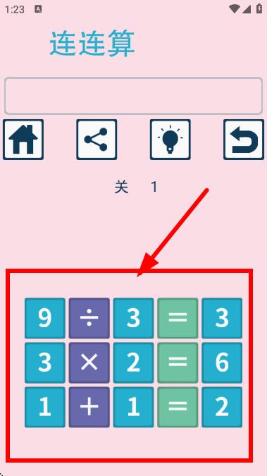3、进入关1界面,根据算式方块,数字,运算符号,等号,移动拼接成正确等式,完成解谜挑战。