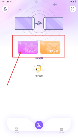 2、切换到传输界面,点击发送文件或接收的文件,按照指引完成设备间文件传输的操作。