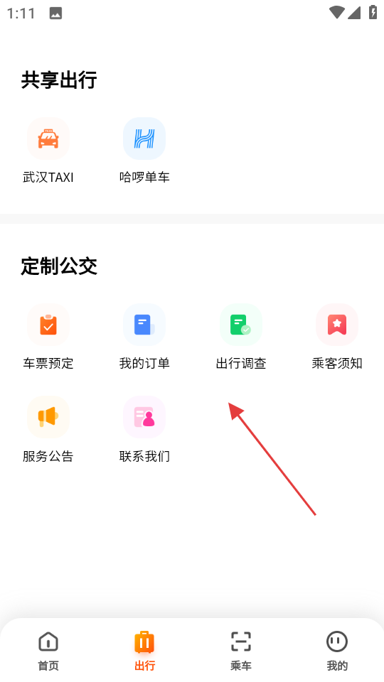 2、出行页面里,有共享出行和定制公交的功能,共享出行可以选武汉TAXI或者哈啰单车,定制公交能车票预定,查看我的订单,还能参与出行调查了解乘客须知。