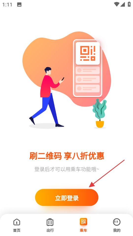 3、乘车页面提示刷二维码乘车能享八折优惠,不过得登录后才能用乘车功能,你点击立即登录,登录后就可以生成乘车二维码,扫码乘车享受优惠,让乘车更方便实惠。