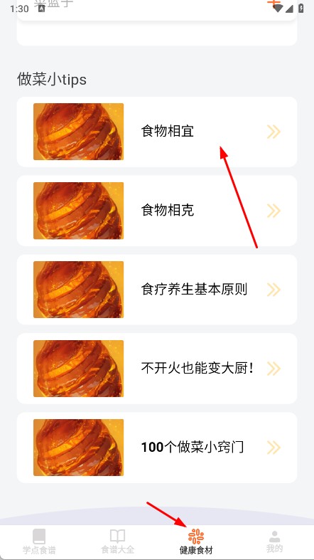 3、进入健康食材页,看做菜小tips,食物相宜相克、食疗养生原则等,了解烹饪知识。