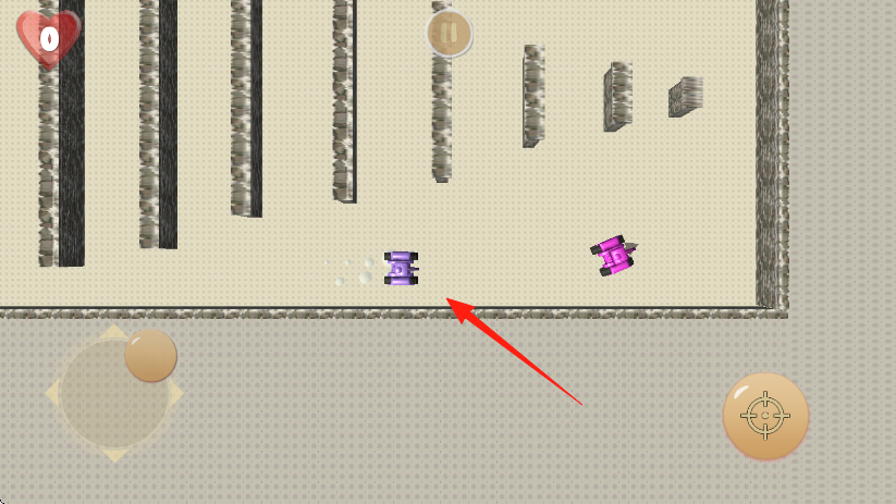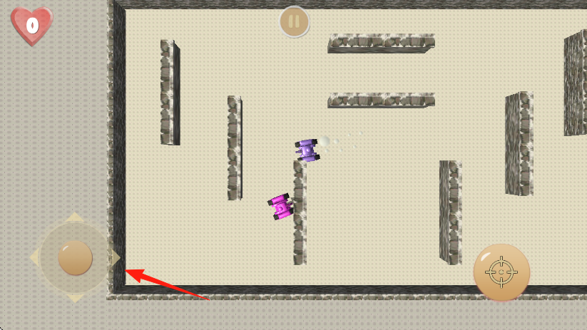 1、通过屏幕左下角的虚拟摇杆红箭头所指操控紫色坦克移动,在迷宫般的地形中寻找有利位置,避开障碍物和敌方坦克攻击。
