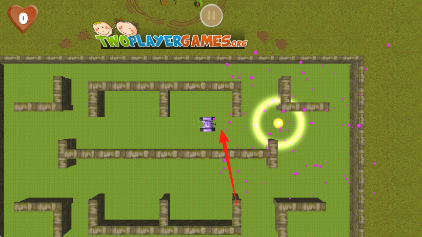 3、如图中绿色草地或复杂的墙体迷宫地形,可利用墙体作为掩体,躲避敌方攻击,同时寻找合适的时机出击,注意左上角的心形标志代表生命值。