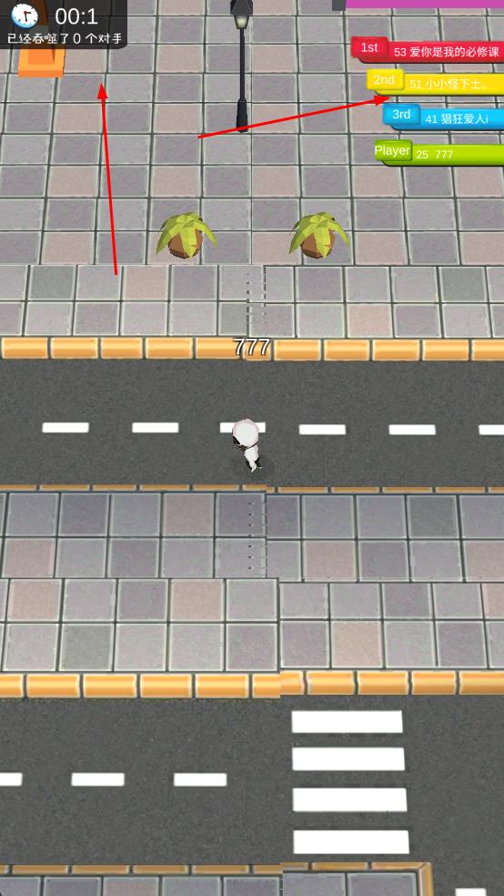 1、进入游戏后,操控白色角色在城市街道移动,吞噬路灯、消防栓等物体,提升自身标识数字。