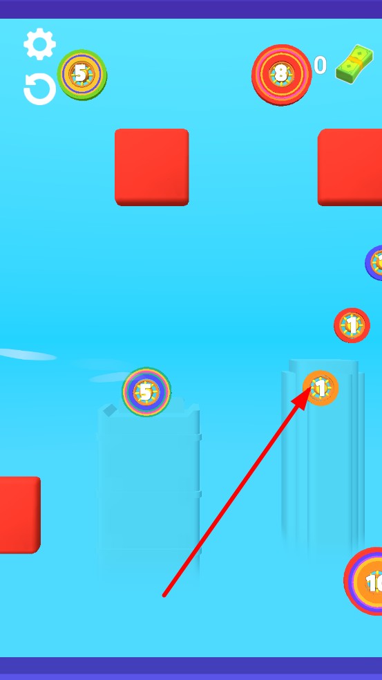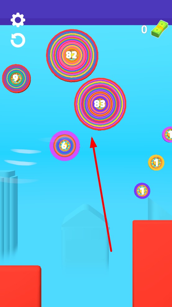3、应急避险:遇红色障碍,快速点击让转轮收缩,穿过缝隙;或借小数字圆盘的轻弹跳,微调方向避险,保障生存与分数两者兼得。