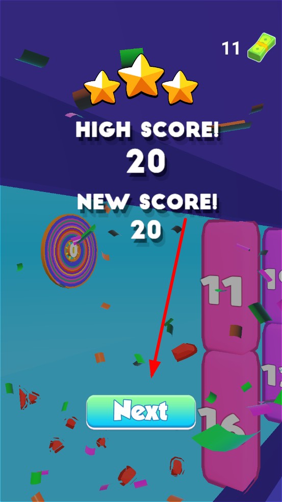 2、色彩爆炸视觉:高饱和蓝底搭配红障碍、彩虹转轮与圆盘,收集时粒子特效迸发,数字叠加如烟花绽放,视觉冲击强烈,营造沉浸式收集体验。