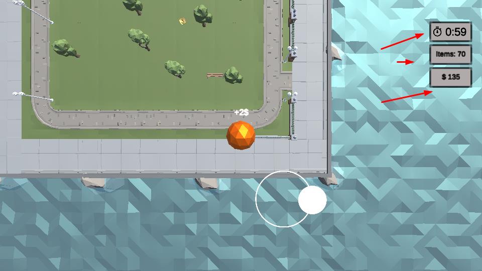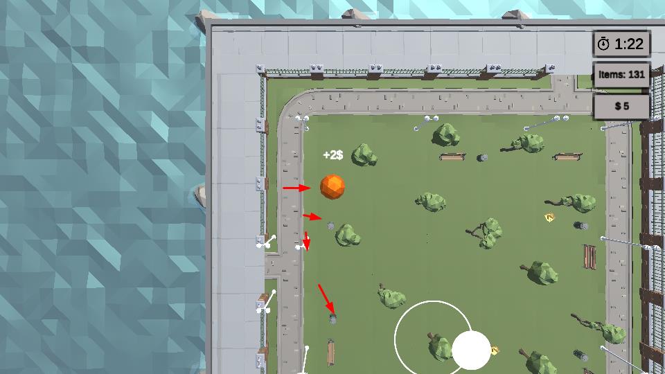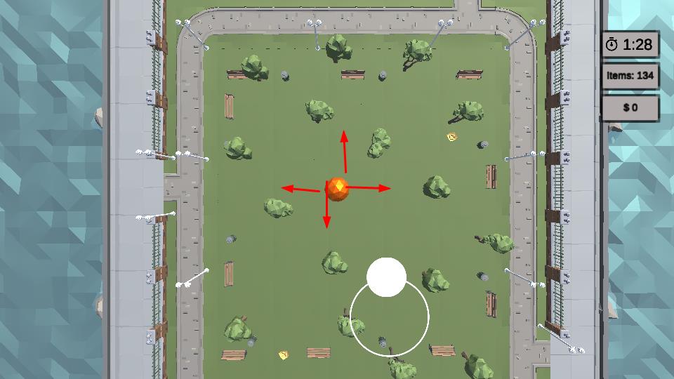 1、操控虚拟摇杆,引导橙色滚球在公园场景移动,规划收集路径。