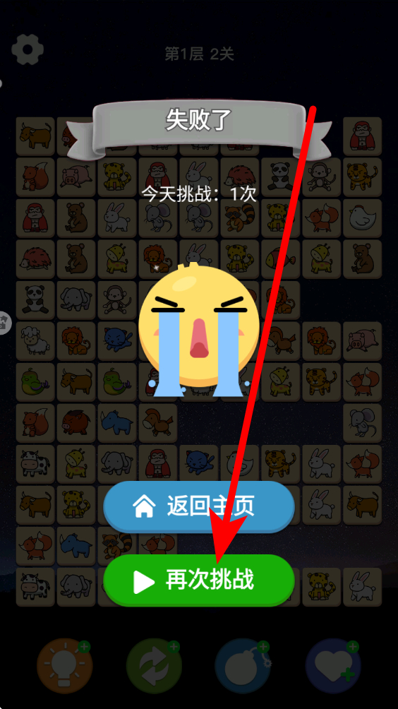 3、重试关卡,若挑战不幸失败后,果断点击再次挑战按钮,重新进入当前关卡,灵活调整策略思路,充分利用之前积累的经验,大胆尝试全新消除路径。