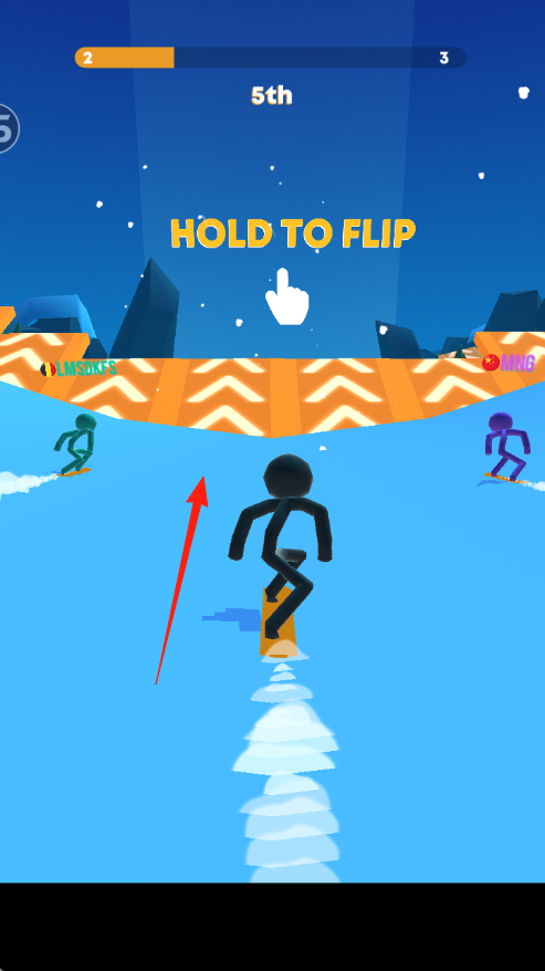 2、遇到橙色拱形障碍物,看到提示HOLDTOFLIP,长按屏幕让火柴人翻转,越过障碍,避免减速或摔倒。
