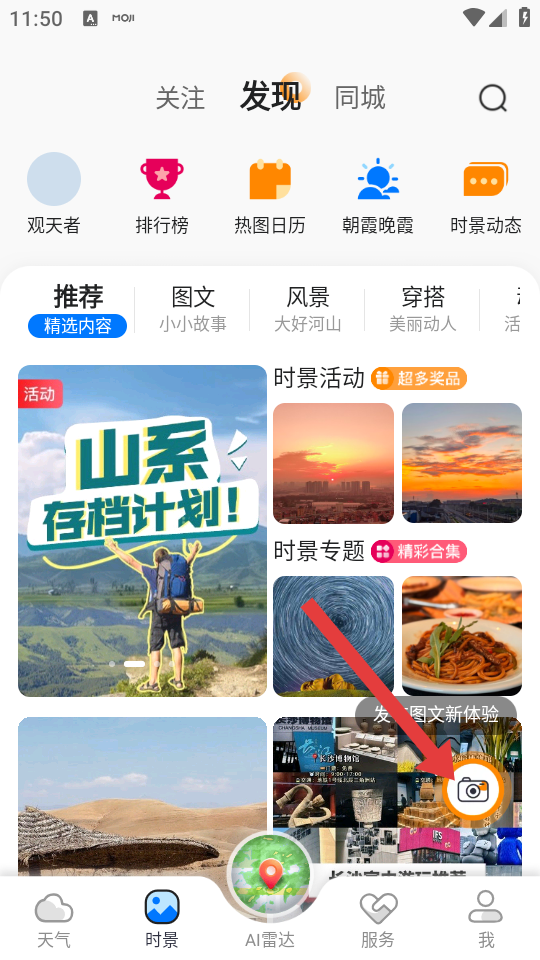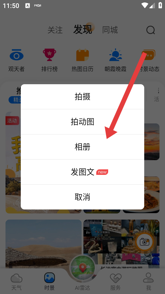 1、打开墨迹天气APP,切换到时景页面,点击右下角相机图标,弹出操作选项菜单,开启实景照片上传流程。